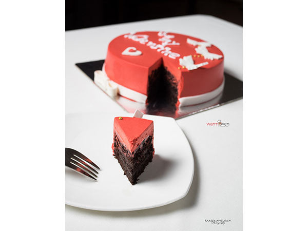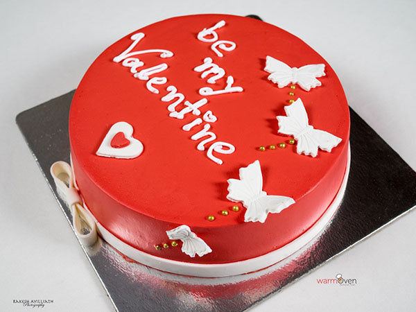 A classy looking chocolate cake with a layer of freshly whipped cream in red and fondant hearts and butterfly to make a perfect cake for your valentine. How can your love say no?