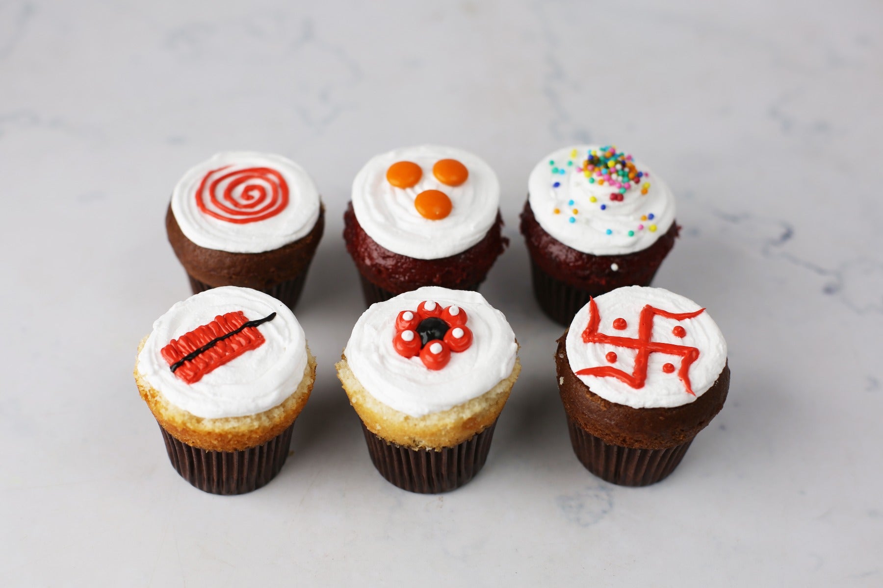 Freshly baked cupcakes in 3 delicious flavors of Red Velvet, Chocolate & Vanilla topped with stunning Diwali theme motifs. A perfect gift on Diwali for your family and friends.