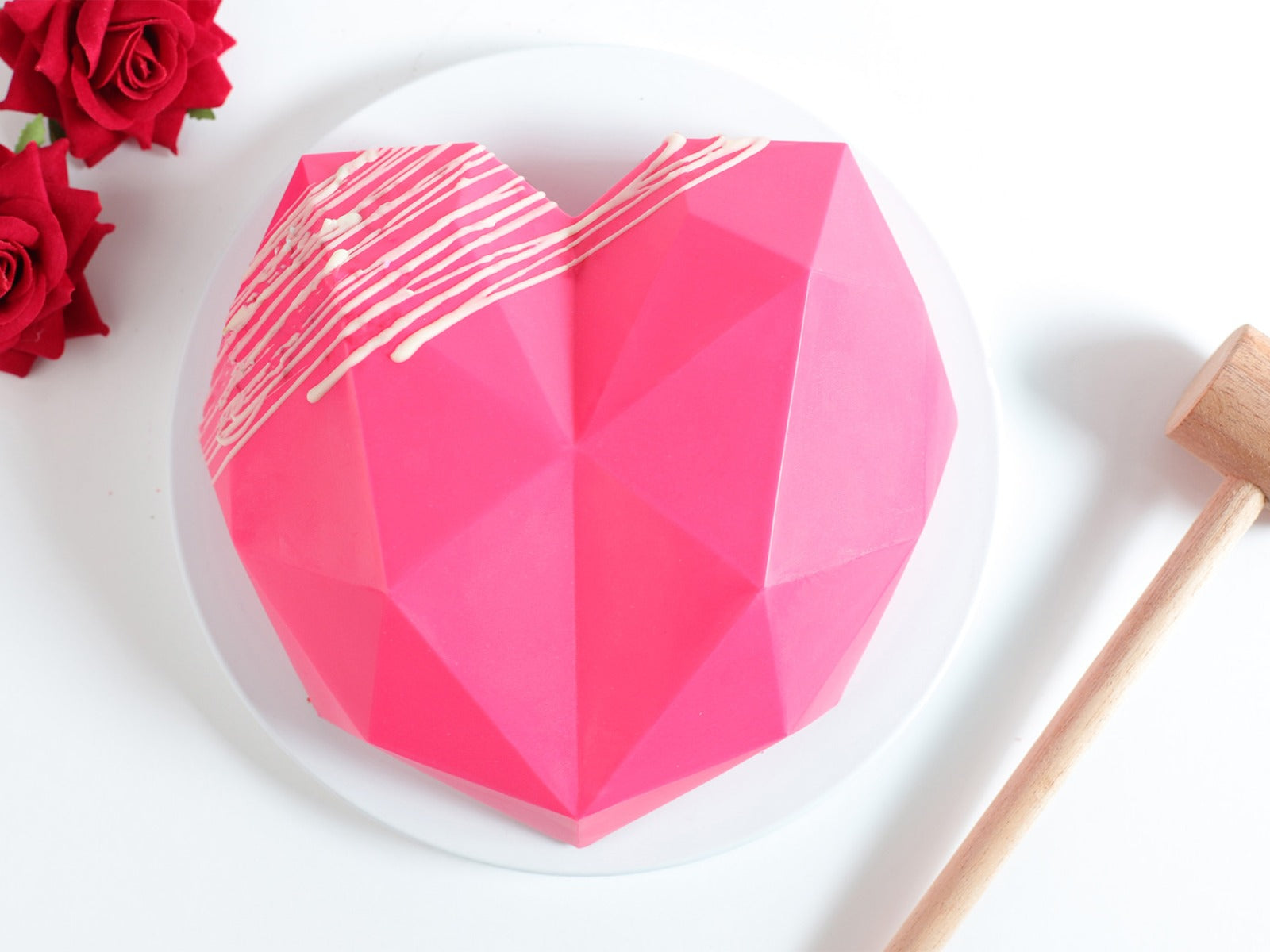 Make Valentine's day fun with this beautiful pink Piñata cake. Use the hammer to break the heart shell made with the finest white chocolate and enjoy the hidden Red Velvet Cake with your loved one. 250 Grams