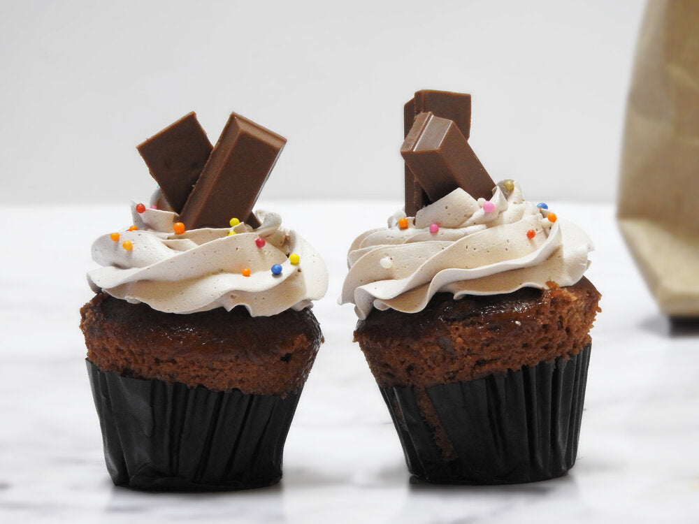 Irresistible chocolate cupcake pairs perfectly with soft swirls of chocolate mousse and bars of KitKat. Every break deserves this delightful dessert!