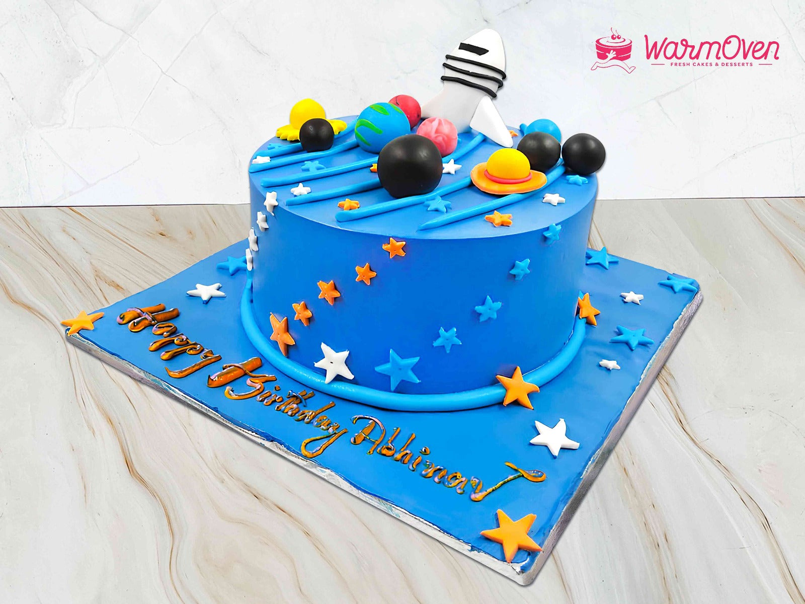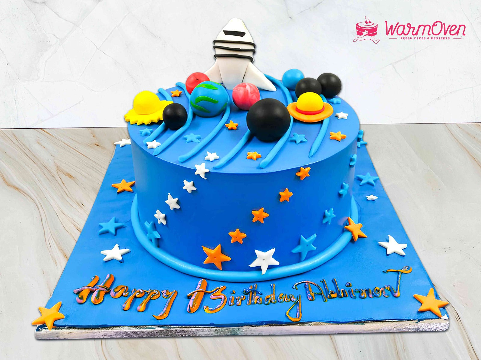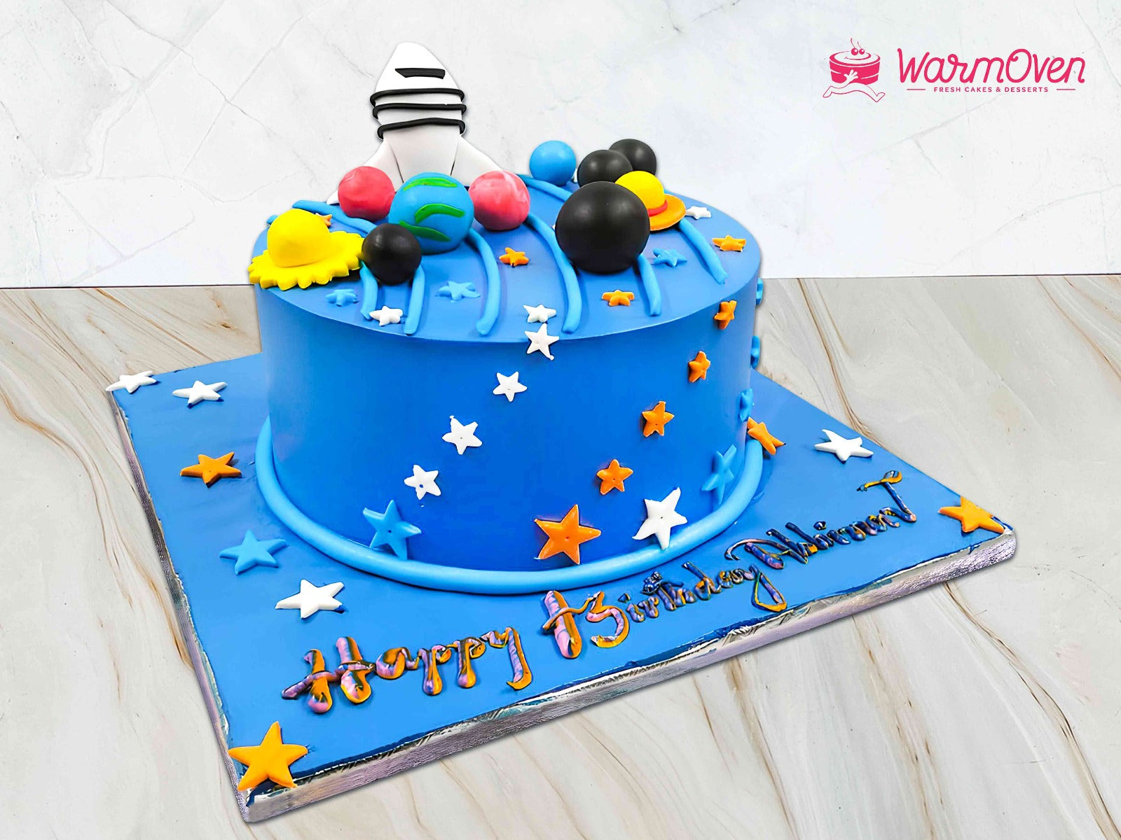 Looking for a custom cake for someone obsessed with the universe and galaxies? Our universe theme custom cake is just the right deal for you. At WarmOven, we believe in giving our customers the luxury of fully customising their cakes just the way they want. You can choose from a wide variety of flavors right from death by chocolate to mixed fruit, you name it at no extra charge. We offer eggless cake variants as well which are as delectable as the rest, so don't hold back and order now!!