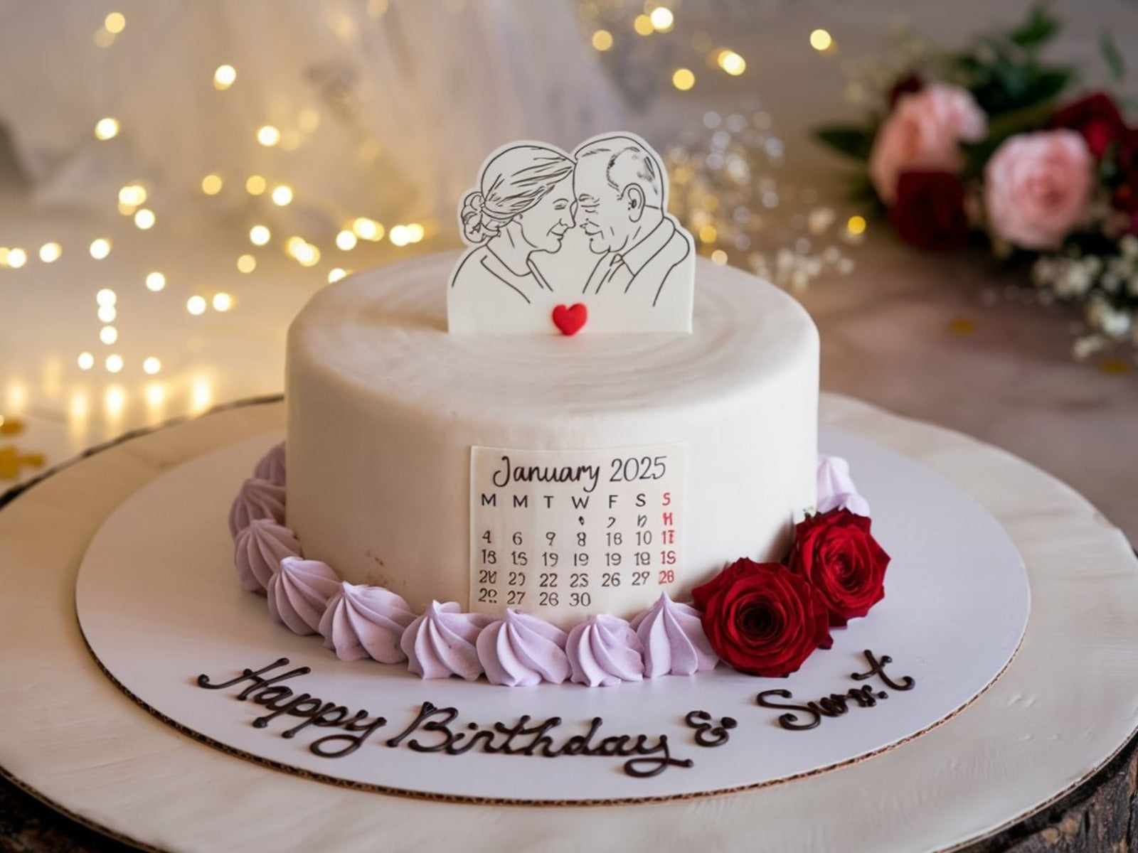 Mark a beautiful milestone with our Timeless Love Anniversary Cake, a stunning creation that captures the essence of love and togetherness. This elegant white fondant cake features an edible sketch of a couple, a personalized calendar highlighting your special date, and romantic details like soft lavender frosting swirls and fresh red roses. Thoughtfully designed to celebrate your journey, this cake is the perfect centerpiece for an anniversary celebration filled with love and memories.