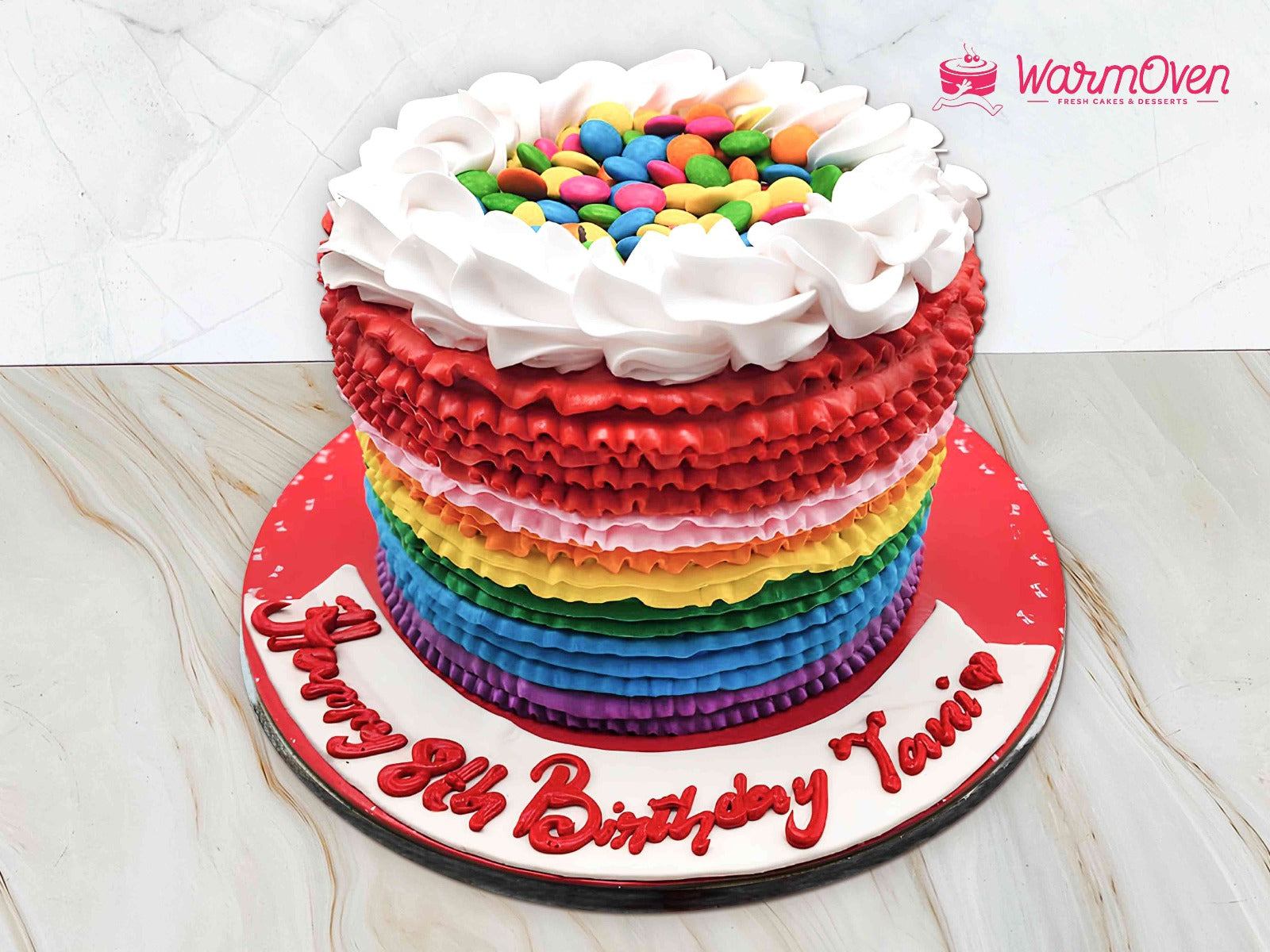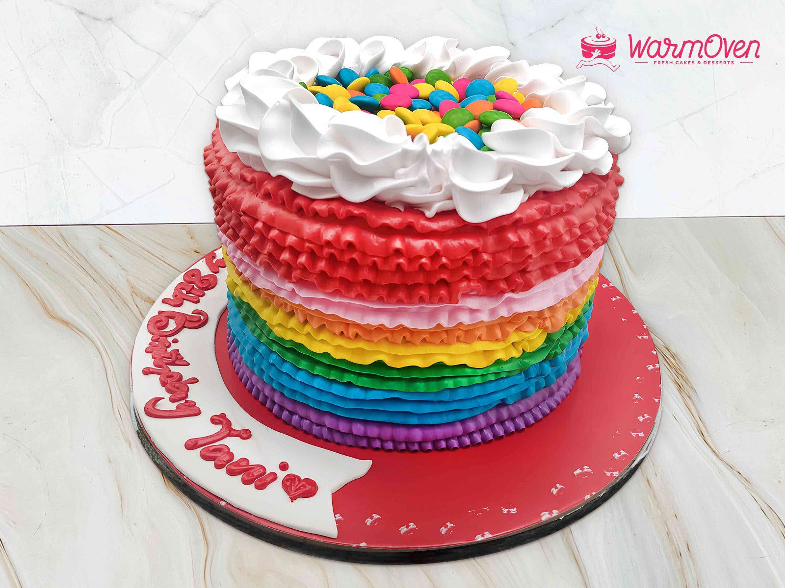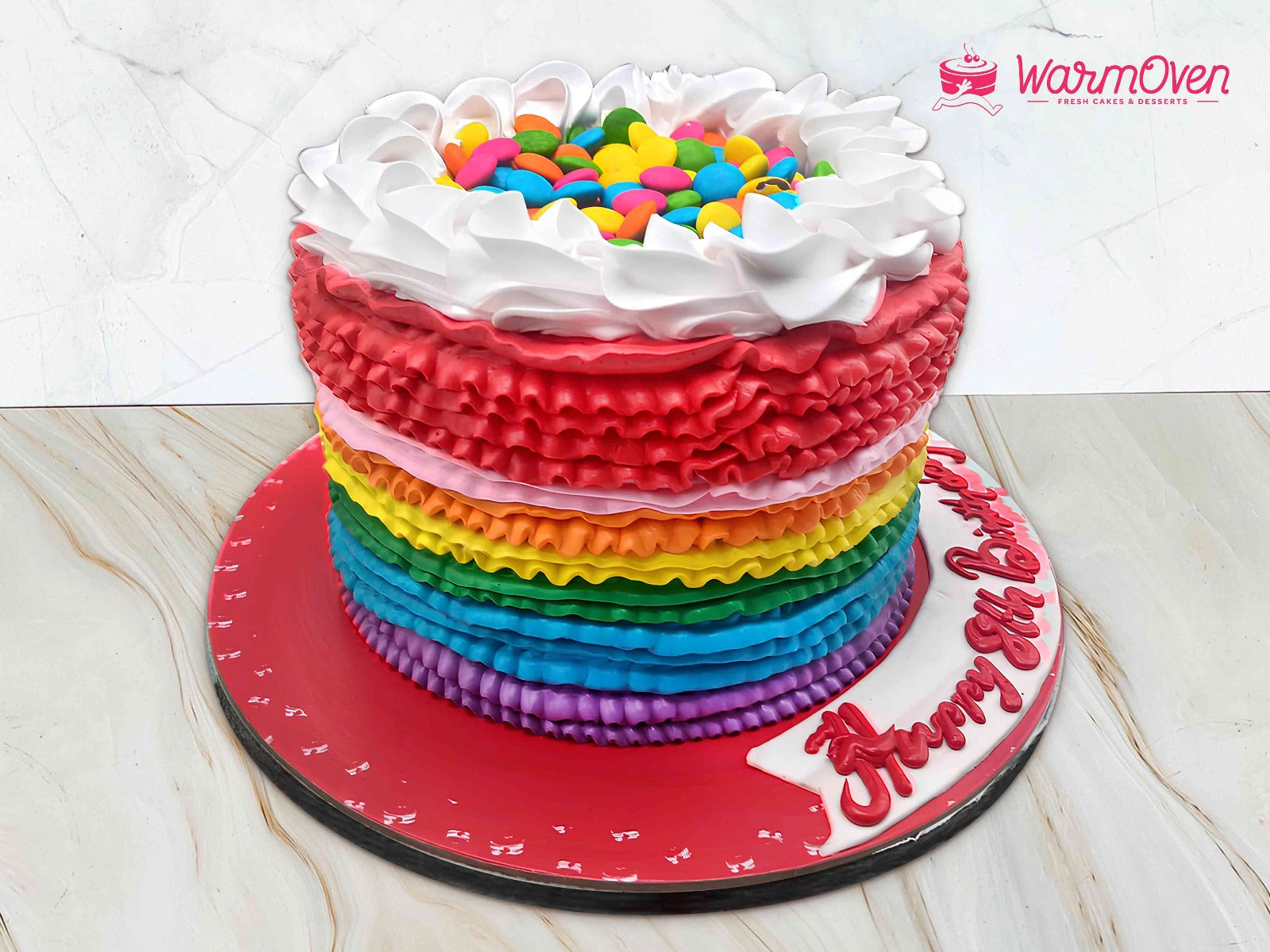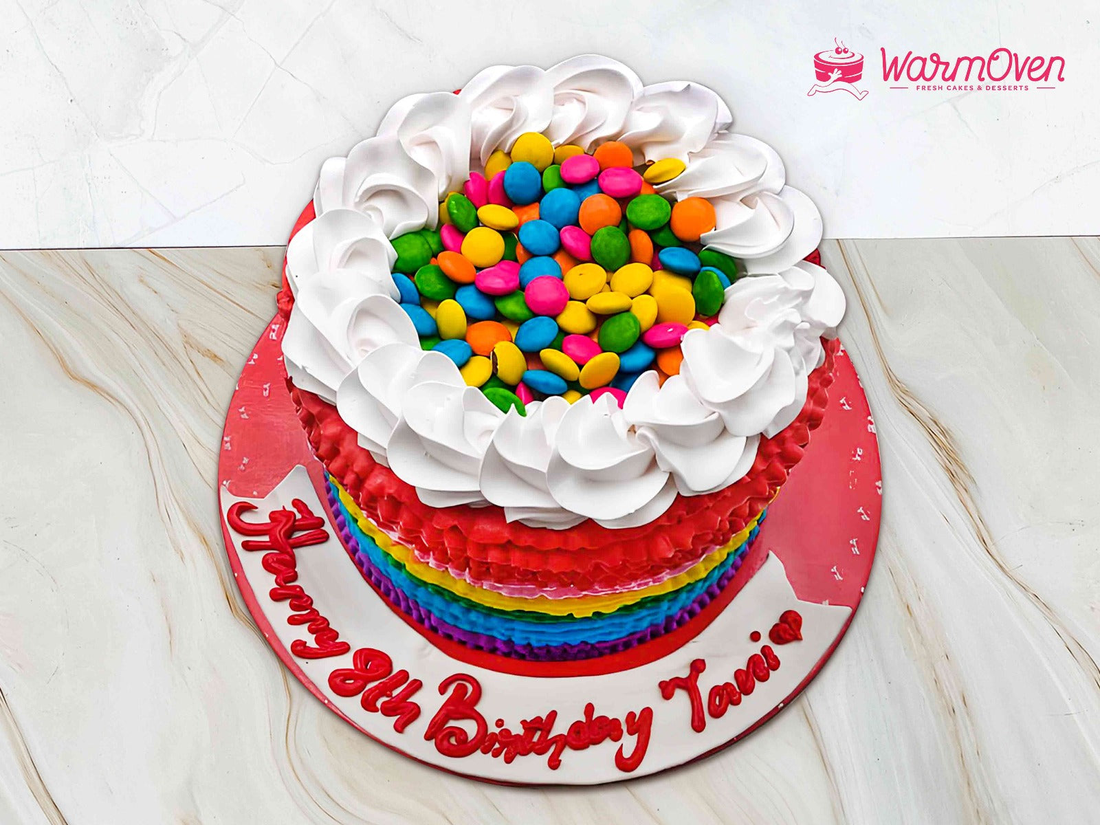 Add a burst of color and fun to your celebration with our rainbow colors gems cake! This cake is decorated with vibrant layers and topped with colorful gems, making it perfect for kids and anyone who loves bright, cheerful designs. Choose from a variety of delicious flavors, freshly baked just for you. Enjoy free home delivery right to your door. Order now from WarmOven and make your party extra special with this delightful and colorful cake!